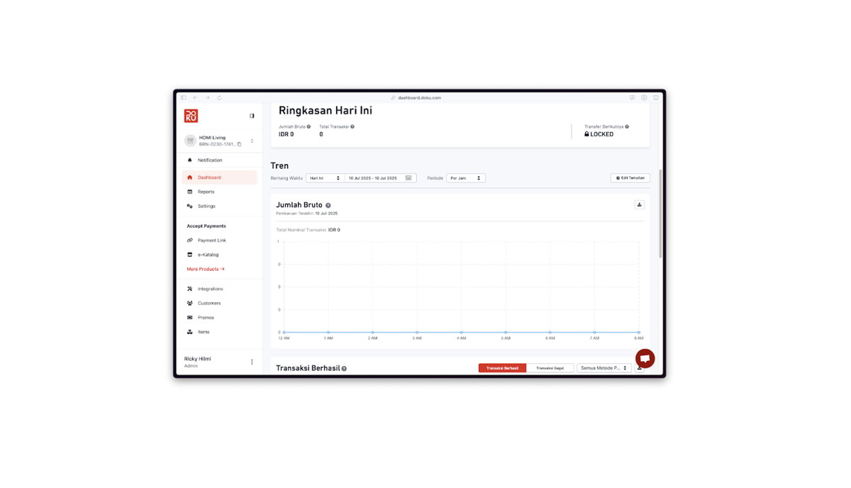 Untuk memverifikasi pembayaran secara otomatis tanpa upload bukti transfer, bisnis memerlukan dashboard payment gateway yang mampu membaca dan mencatat status transaksi secara real time. Semua pembayaran dari berbagai metode seperti VA, QRIS, e-wallet, kartu, dan lainnya akan langsung dikenali sistem tanpa proses manual. Solusi yang menyediakan kemampuan ini salah satunya adalah DOKU Dashboard, pusat kendali pembayaran untuk seluruh produk terima pembayaran DOKU, pionir perusahaan payment gateway tanah air.