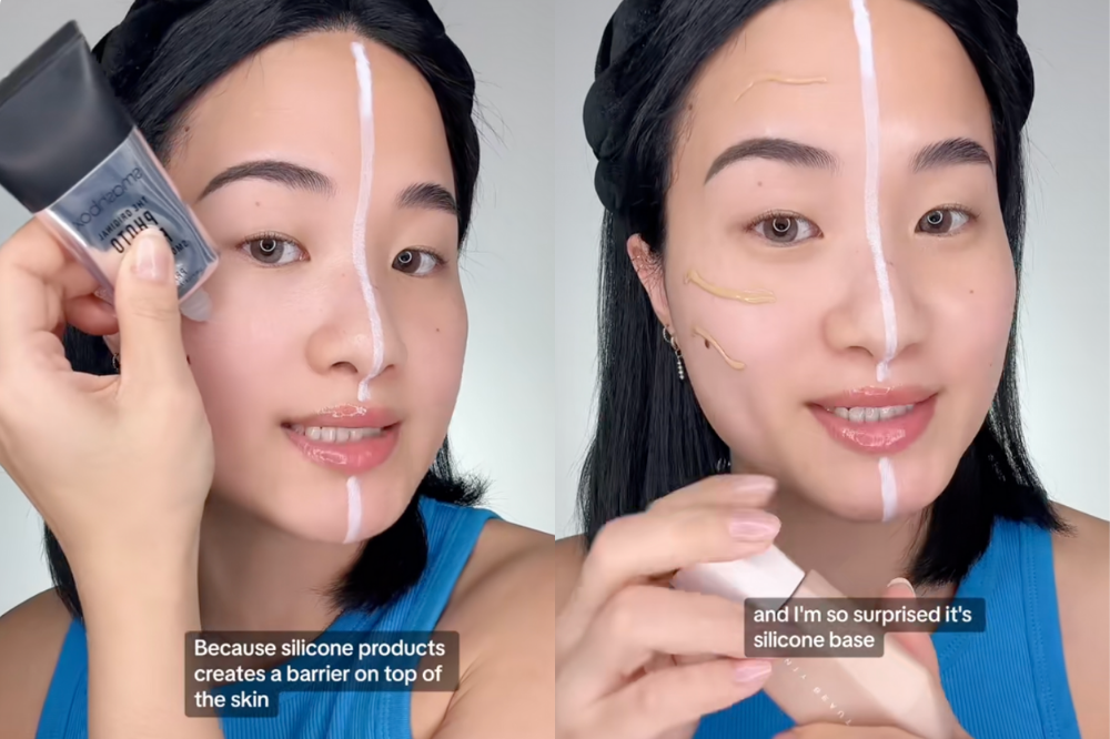 Rea Ann Silva menunjukkan penyebab umum lain dari penumpukan makeup, yaitu produk perawatan kulit berbahan dasar silikon, terutama jika berlapis-lapis. Mengaplikasikan beberapa formula silikon terlalu berdekatan dapat mencegah kulit kamu menyerap kelembapan sepenuhnya. Hal ini menyebabkan penumpukan silikon di permukaan kulit, yang pada gilirannya menyebabkan penumpukan. Jadi, bagaimana kamu mengenali silikon dalam produk? Meskipun tidak sejelas air atau minyak, tetap mendeteksinya cukup mudah. Carilah bahan-bahan yang berakhiran “-cone,” “-siloxane,” atau “-methicone” yang tercantum di antara dua hingga tiga bahan pertama. Meskipun air adalah bahan pertama, keberadaan istilah silikon ini di awal daftar menunjukkan produk tersebut berbahan dasar silikon.